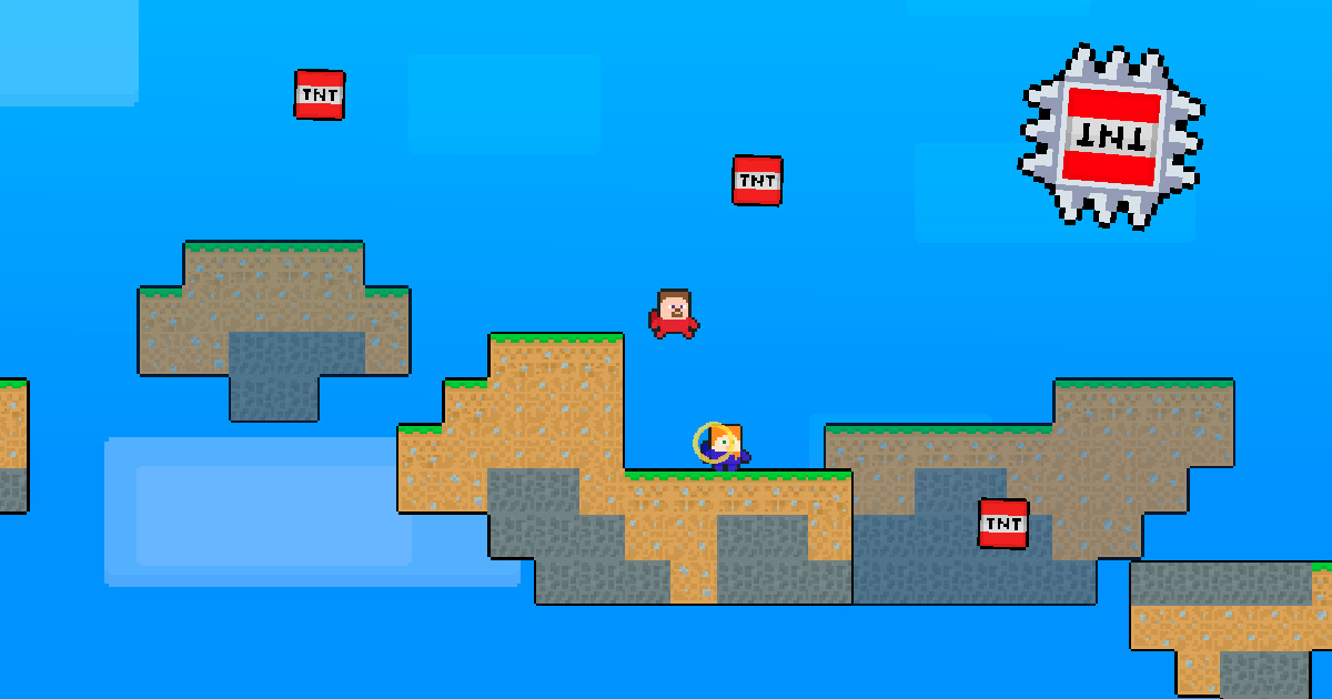 Two astronauts must survive in the domain of skyblock, one named Steve and the other Alex. Aid these two allies and direct them to the portal, or they may face failure. The terrain is riddled with hazardous TNT boulders and swirling sharp TNTs that can obliterate you if you stray beyond the safety zone; proceed with utmost vigilance. Gather 3 gold ingots with your companion, and one of you will enter the portal.